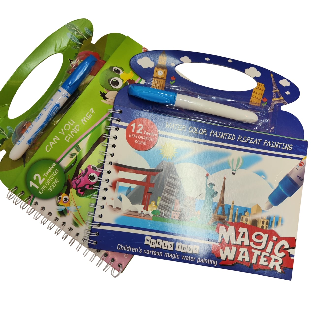 دفتر نقاشی جادویی مجیک واتر یا “Magic Water Book” یک دفتر نقاشی مخصوص کودکان است که بدون نیاز به جوهر، رنگ یا مداد رنگی عمل میکند. تنها کافیست قلم همراه دفتر را با آب پر کرده و روی صفحات بکشید تا تصاویر رنگی ظاهر شوند. پس از مدتی که صفحات خشک شوند، رنگها محو شده و کودک میتواند دوباره نقاشی را تکرار کند. این ویژگی باعث میشود این محصول هم آموزشی باشد و هم کاملاً اقتصادی و قابل استفاده مکرر.روی صفحات بکشید تا تصاویر رنگی ظاهر شوند. پس از مدتی که صفحات خشک شوند، رنگها محو شده و کودک میتواند دوباره نقاشی را تکرار کند. این ویژگی باعث میشود این محصول هم آموزشی باشد و هم کاملاً اقتصادی و قابل استفاده مکرر.