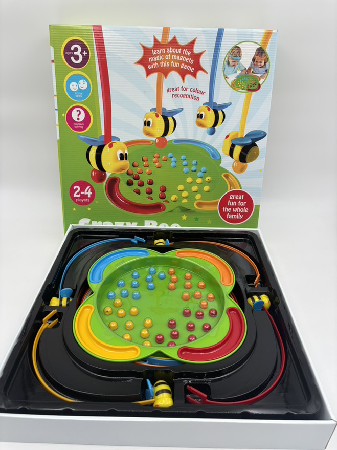 بازی فکری زنبور دیوانه (Crazy Bee) یک بازی هیجانی با سرعت عمل بالا برای 2 تا 4 بازیکن است. یک هدبند زنبور عسل را بردارید و بدون استفاده از دست، توپ های مغناطیسی را بردارید! ببینید چه کسی همه توپهای رنگی خود را اول جمع میکند، یا برای جمعآوری هرچه بیشتر توپها مسابقه دهید تا زمانی که همه توپها از صفحه بازی خارج شوند.