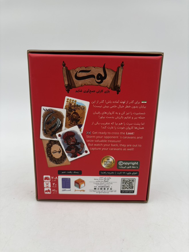در بازی فکری لوت ، شما و سایر بازیکنان در نقش سر دستۀ راهزنها ایفای نقش میکنید و باید کاروانهای عبوری از مسیر خودتان را تا جایی که میتوانید غارت کنید و دست خودتان را از کارت های با ارزش بدست آمده پر کنید. قیمت بازی لوت بسیار مناسب بوده و با خرید آن میتوانید لحطات ناب و به یادماندنی را در کنار دوستان و اعضای خانواده خود تجربه کنید.