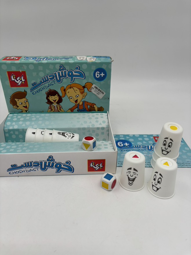در جعبه این بازی 9 لیوان کوچک پلاستیکی وجود دارد که روی آنها شکلکهای بامزهای ترسیم شده است. کف لیوانها با سه رنگ متمایز (آبی، قرمز، زرد) و با سه شکل هندسی (دایره، مربع و مثلث) از هم تفکیک شدهاند.