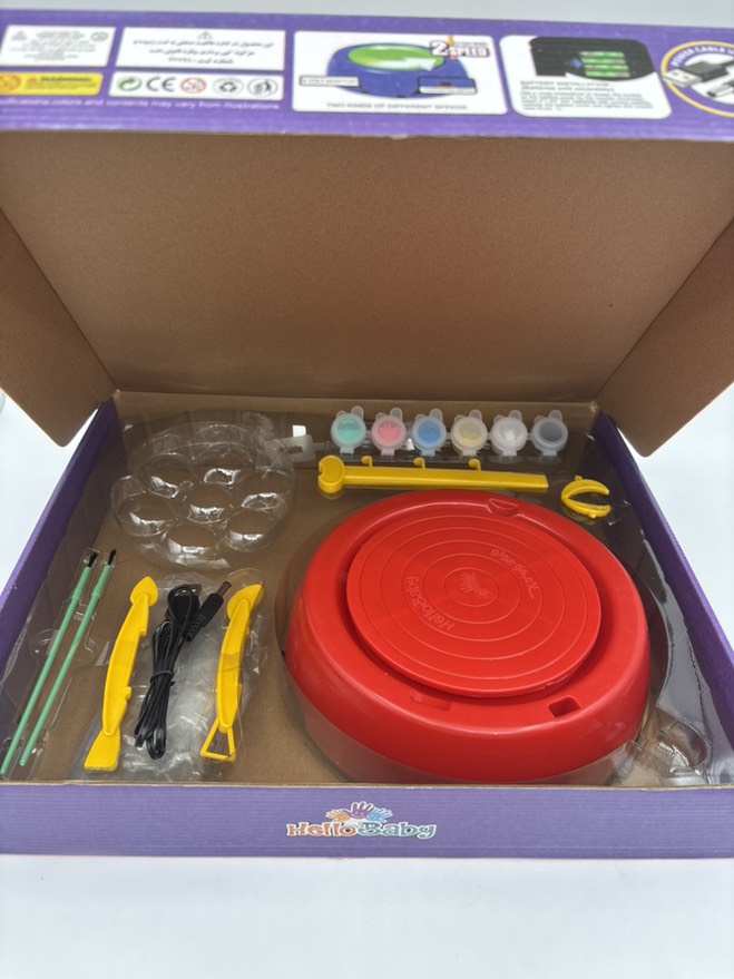1 عدد چرخ سفالگری , 1 عدد گل سفالگری , 6 رنگ مایع سفالگری , ابزار شکل دهی و برش , 2 عدد قلم مو رنگ آمیزی , میله تنظیم ارتفاع , نخ برش قالب دسته دار ، سفره بزرگ ، دفترچه راهنما و توضیحات