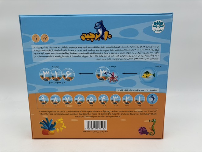 بازی فکری ۱۰ برچین شامل ۱۳۲ پولک مقوایی است که کودک به روش های مختلفی می تواند خود را با آن سرگرم کند و مهارت های خود را تقویت کند. در یک طرف پولک ها اعداد ۱ تا ۹ نوشته شده است و در طرف دیگر تصاویری از حیوانات دریایی چاپ شده است. در این بازی کودکان به طور غیر مستقیم جمع ذهنی را فرا میگیرند
