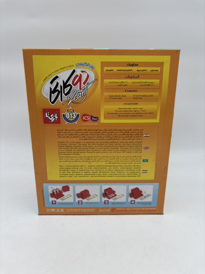 این بازی فکری شامل صفحه پلاستیکی، ۷۲ کارت تصاویر، ۳۶ کارت مقوایی کلمات سه حرفی، یک دستگاه کارت انداز و یک سیدی آموزش کلمات سه حرفی انگلیسی و قانون بازی می باشد. این بازی برای آن دسته از کودکانی که با زبان انگلیسی آشنایی مقدماتی دارند، طراحی شده است. در این بازی با روش قرار گرفتن حروف الفباء انگلیسی در کنار یکدیگر و ساخت کلمات ساده 3 حرفی انگلیسی آشنا خواهید شد. این بازی را با توجه به سطح آشنایی به زبان انگلیسی و گروه سنی کودکان به دو صورت رقابتی و مشارکتی می توان بازی نمود.