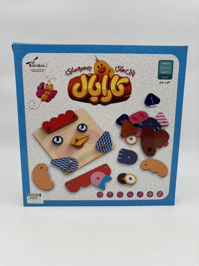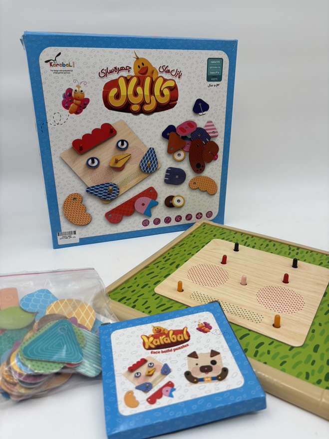 معرفی اجمالی پازل چهره سازی کارابالبازی فکری پازل چهره سازی کارابال یک بازی بسیاز زیبا و خوش ساخت برای ودکان بالای 3 سال است که در آن با قرار دادن قعات رنگارنگ روی پین هایی که در صفحه ی پایه قرار دارند چهره های شگفت انگیز و خلاقانه بسازند. در این بازی 30 کارت تصویثری الگوسازی به همراه 27 قطعه ی پازلی طرح دار وجود دارد که کودکان می توانند با نگاه کردن به کارت ها و جاگذاری قطعات تصاویر روی کارت ها را بسازند.