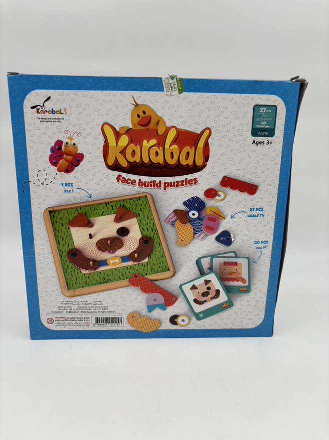 بازی فکری پازل چهره سازی کارابال یک بازی بسیاز زیبا و خوش ساخت برای ودکان بالای 3 سال است که در آن با قرار دادن قعات رنگارنگ روی پین هایی که در صفحه ی پایه قرار دارند چهره های شگفت انگیز و خلاقانه بسازند. در این بازی 30 کارت تصویثری الگوسازی به همراه 27 قطعه ی پازلی طرح دار وجود دارد که کودکان می توانند با نگاه کردن به کارت ها و جاگذاری قطعات تصاویر روی کارت ها را بسازند.