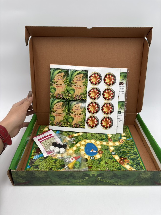 دارای: ۶ عدد مهره دکمه ای- ۴ عدد مهره رنکی- ۱۲ عدد کارت- ۸ عدد کارت شانس