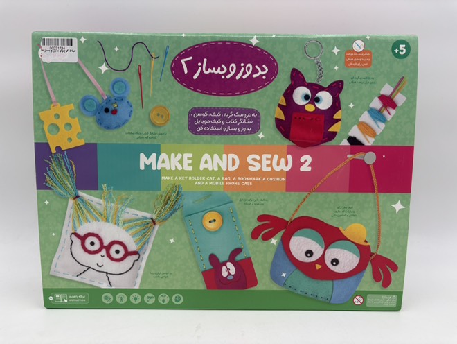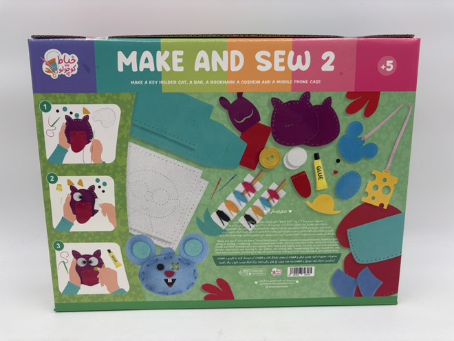 این بسته برای کودکان بالای 5 سال مناسب است و برای پرورش خلاقیت ، تقویت هماهنگی چشم و دست و افزایش دقت و تمرکز کودکان بسیار مفید است. همراه بدوز و بساز 2 نخ و سوزن پلاستیکی بی خطر و الیاف برای پر کردن عروسک ها وجود دارد.