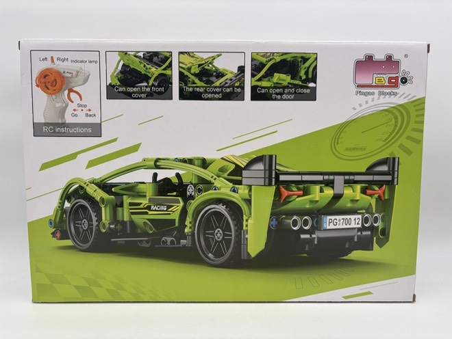 این ماشین لگو از 428 قطعه پلاستیکی تشکیل شده است که توسط برند PINGAO BLOCKS تولید شده اند. طراحی این ماشین به صورت یک ماشین اسپرت و مسابقه ای بوده که کیفیت ساخت بالایی نیز دارد. این ماشین در مقیاس ۱ به ۱۶ ساخته شده و پس از ساخت درب های کناری به اضافه صندوق و کاپوت جلو قابلیت باز شدن به وسیله دست را دارند. از دیگر قابلیت های جذاب این محصول کنترلی بودن آن است که به وسیله یک موتوری که از طریق باتری شارژی تغذیه می شود و کنترل از راه دور امکان پذیر است. همچنین ابعاد این ماشین پس از ساخت 25 در 12 با ارتفاع 6.5 سانتی متر خواهد بود.