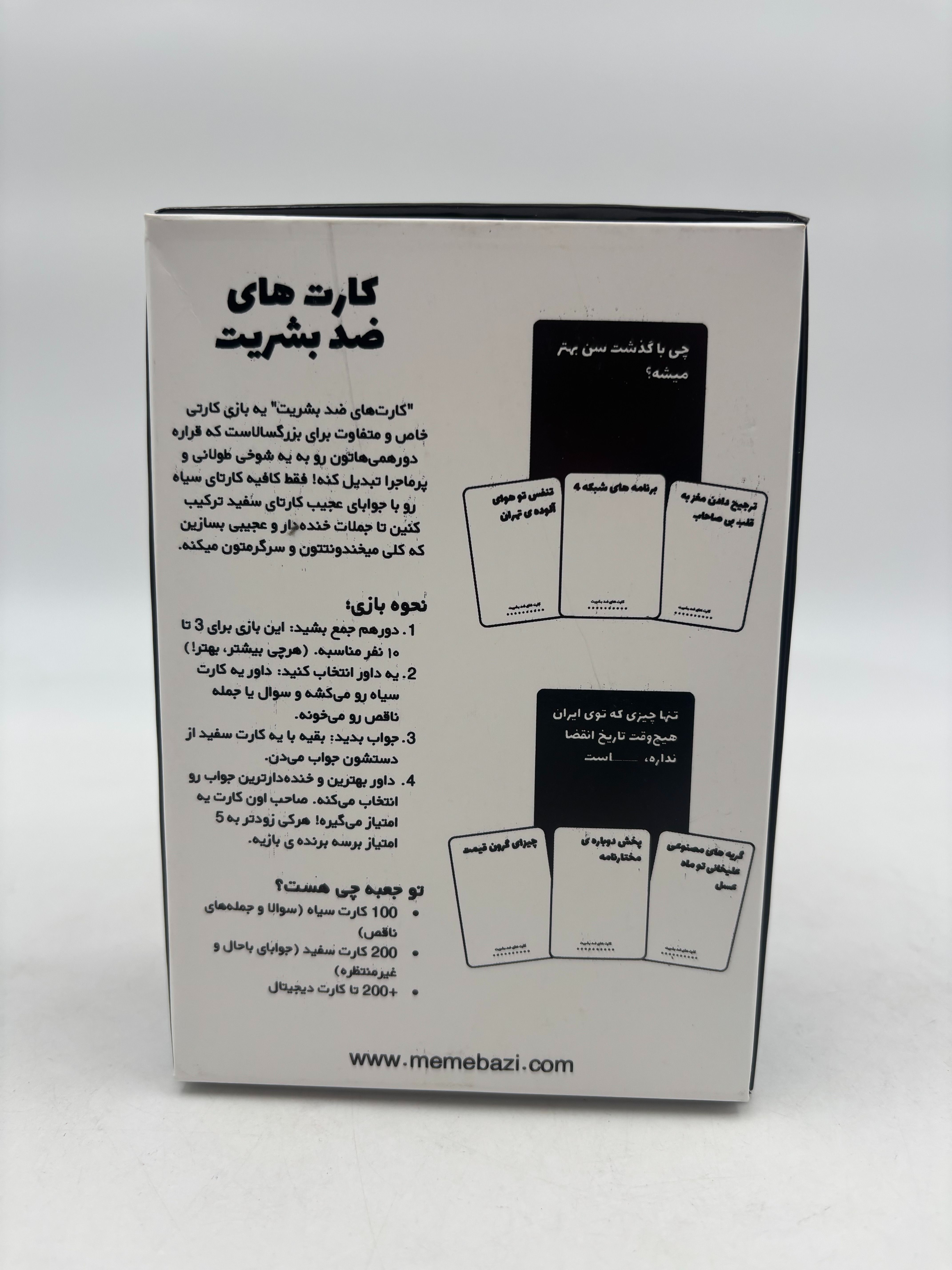 با کارتهای ضد بشریت، لحظاتی پر از خنده و شادی را با دوستانتان تجربه کنید! این بازی هیجانانگیز و پرطرفدار، خلاقیت و طنز شما را به چالش میکشد. ایدهآل برای دورهمیها و مهمانیها، آمادهاید تا بهترین لحظات را بسازید؟ همین حالا این بازی مهیج را به سبد خرید خود اضافه کنید و لذت ببرید!