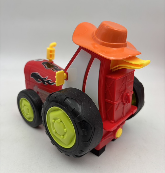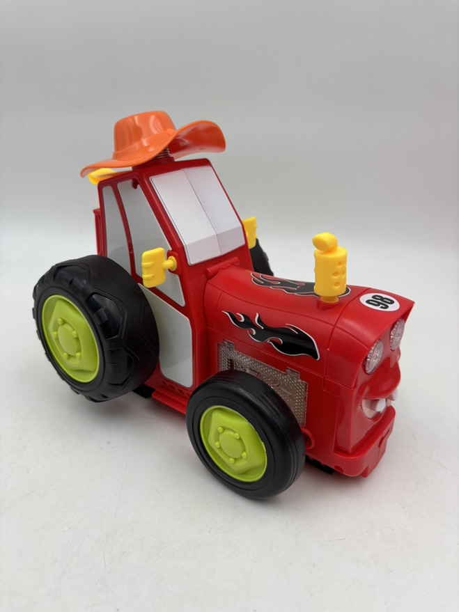 اسباب بازی تراکتور موزیکال کنترلی دیوانه این محصول وارداتی باطری شارژی و دارای کابل شارژ می باشد قدرت بدنه ، رنگبندی ، کیفیت کنترل و جزئیات زیبا و جا دادن تمام بخش های مربوط به باطری و کابل شارژ در عقب محصول از جمله ویژگی های متعدد این محصول می باشد این محصول بسیار شبیه تراکتور های داخل انیمیشن ماشین ها است کنترل محصول دارای دو دکمه که هر کدام مخصوص چرخ های جلو و عقب به صورت جداگانه می باشد و یک دکمه برای پروگرم می باشد ابعاد خود تراکتور تقریبا 21*13 سانت ابعاد کنترل تقریبا 8*10سانت